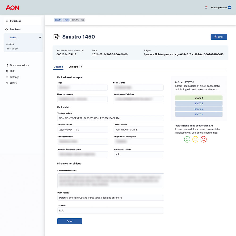 AON opera in un contesto complesso, con clienti di diversi settori e compagnie assicurative con modelli organizzativi differenti, cosa che comporta la gestione di grandi volumi di dati e l’interazione tra più sistemi. Nel caso Mobility Claim (sinistri r.c. auto), Mozart ha presentato uno studio di fattibilità per ottimizzare i flussi informativi. La proposta prevede la centralizzazione dei dati e lo sviluppo di un applicativo web-based a supporto del team, con eliminazione dei trasferimenti manuali, riduzione di errori e costi e maggiore efficienza operativa. Per facilitare integrazione e analisi dei dati, è stato utilizzato un modello AI.