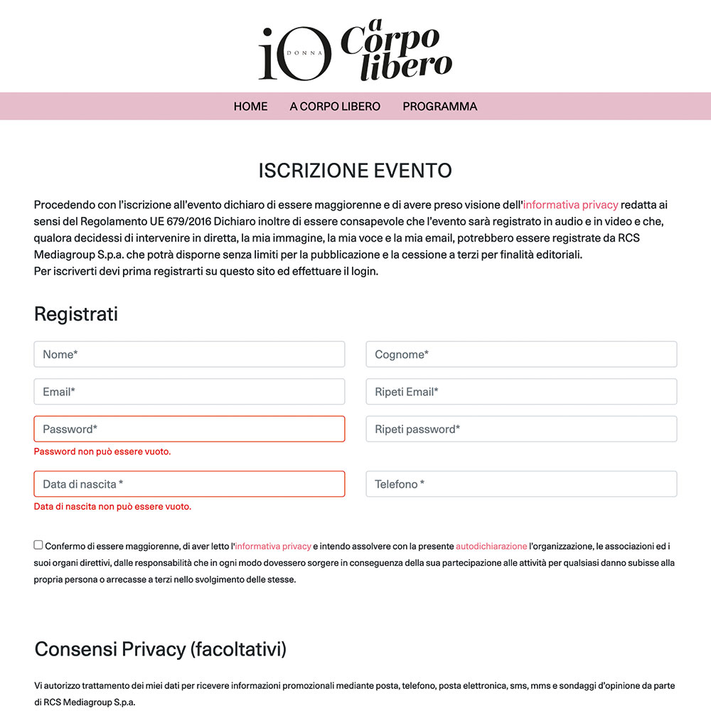 iscrizione online integrata con CRM di RCS. L'utente riceve un QRCode da mostrare all'ingresso,